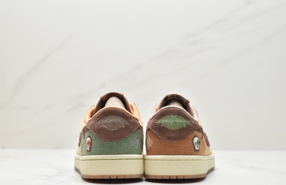 The Air Jordan 1 Low “Voodoo” is a special New Orleans-inspired colourway of the classic sneaker that was released alongside basketball star Zion Williamson’s Nike Zion 2 of the same nickname. This sneaker is inspired by voodoo dolls, a fixture of New Orleans’ lore. Here, a mismatched colour block highlights the shoe’s singular appearance. Specifically, beige-coloured suede is found on the mid-panel and brown suede appears on the perforated toe. Burlap-like overlays are designed in a mismatched colour block of green and brown on the toe, forefoot, eyelets, and heel of the left and right shoe. Brown stitching complements the tonal Swoosh on both sides of the shoe.
